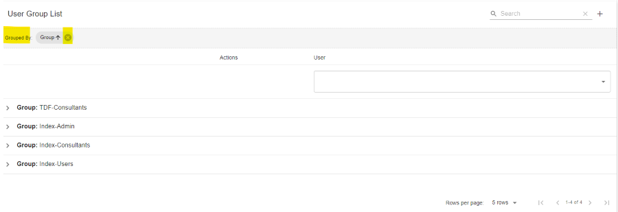 Per default, the User Group List is grouped by user group. You can remove the grouping by clicking the x in the “Group” field in the Grouped By section.