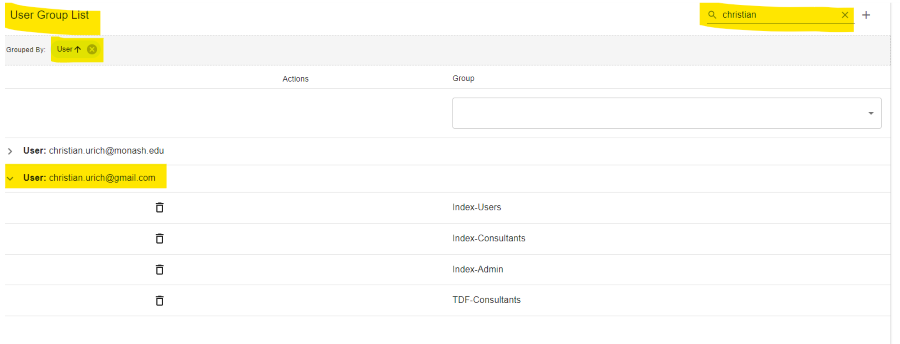 By dragging a column header into the “Grouped By” section you can group the list by that column. Using the search field you can search for a specific user or user group. The example below shows the User Group List grouped by user name and filtered for users with the name “christian”. This allows you to quickly find all user groups a user is part of.
